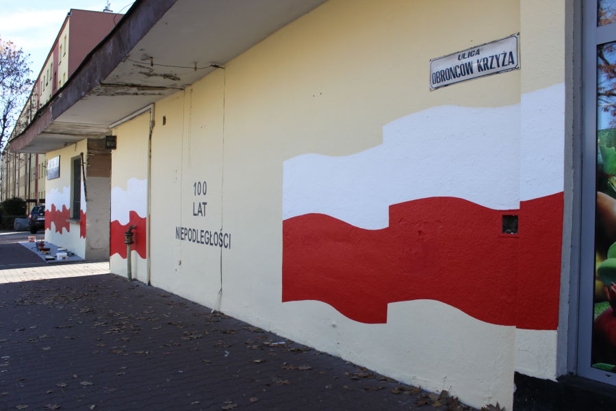 Murale z flagą narodową zostały namalowane na ścianie pawilonu na os. Jagiellońskim 7 i pawilonu przy ul. Krowoderskich Zuchów 21. Są nie tylko okazją to uczczenia rocznicy odzyskania przez Polskę niepodległości ale także elementem akcji „Kochasz swój kraj to po nim nie bazgraj” , której inicjatorem jest Waldemar Domański, lider Pogromców Bazgrołów. Zdaniem Domańskiego namalowanie wizerunku flagi bądź godła ma zniechęcić wandali do zamalowywania elewacji pseudograffitti ponieważ symbole Rzeczypospolitej są objęte ochroną prawną, a za ich zbezczeszczenie grozi m.in. karą grzywny do 5 tysięcy złotych. Oba murale namalował Jacek Pasieczny, artysta malarz.