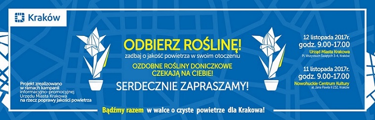 W ramach kampanii informacyjno-promocyjnej Urzędu Miasta Krakowa na rzecz poprawy jakości powietrza w naszym mieście, będą rozdawane ozdobne rośliny doniczkowe. Będzie ich aż 10 000! Wybierz termin, (11 lub 12 listopada 2017r. ) oraz dogodną dla siebie lokalizację (Magistrat - Plac Wszystkich Św., Nowohuckie Centrum Kultury), przyjdź i odbierz dla siebie lub swoich bliskich ozdobną roślinę doniczkową.