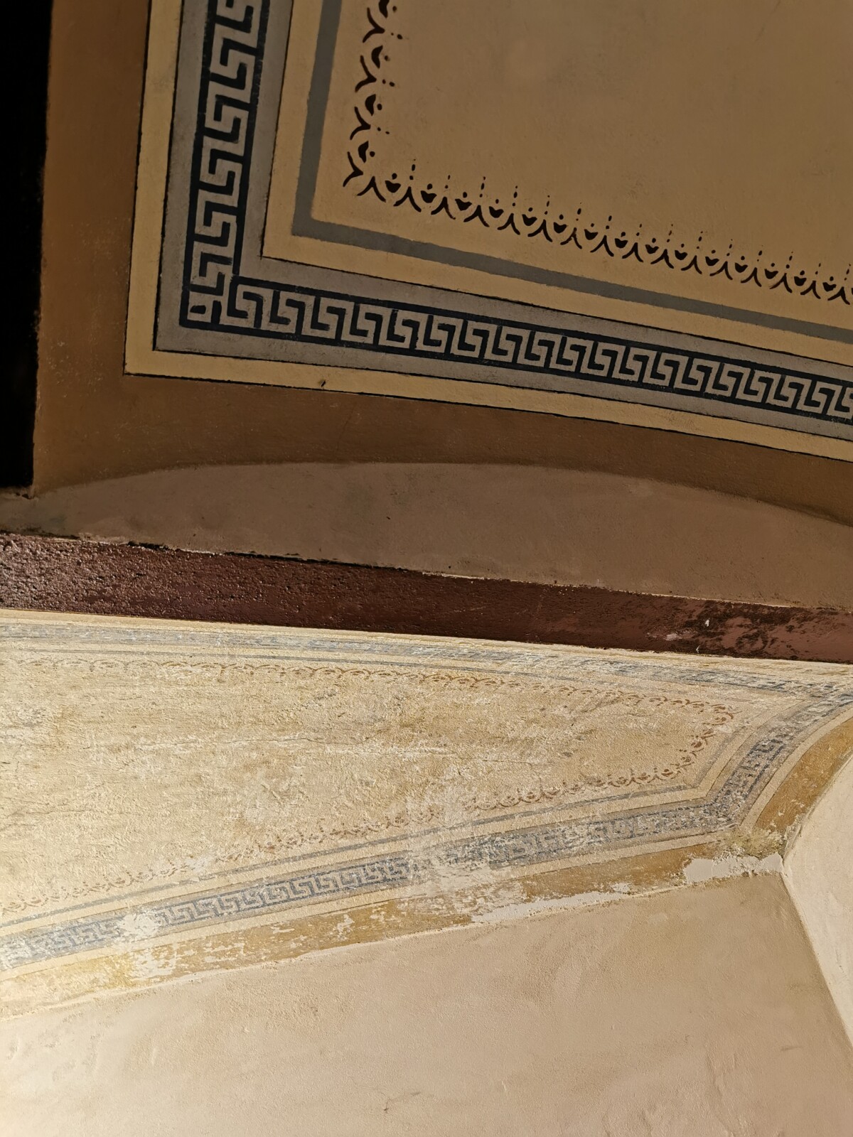 Za dekoracyjną fasadą kryło się nie mniej interesujące wnętrze: z polichromiami czy nietypową jak na Kraków drewnianą balustradą schodów. Szczególnie bogate jest zdobienie sieni wejściowej, gdzie na ścianach znajdują się malowane imitacje kamiennych dekoracji, w tym okładzin ścian i rzeźbionych głowic pilastrów, a także malowidła na sklepieniu utrzymane w modnej wówczas stylistyce pompejańskiej - nawiązującej do rzymskich polichromii odkrytych przez archeologów. Malowidłami pokryta była również klatka schodowa, gdzie na uwagę zasługują przede wszystkim ornamenty widoczne na podniebiach, czyli spodnich częściach biegów schodów oraz pięter i półpięter. Widoczne tu polichromie wykonywane były od szablonów, co pozwalało na pewną powtarzalność wykorzystywanych wzorów. Dopełnieniem wnętrz była stolarka drzwi do mieszkań oraz wspomniana balustrada schodów z drewnianymi tralkami, znacznie mniej popularna w mieście pod Wawelem niż metalowa.